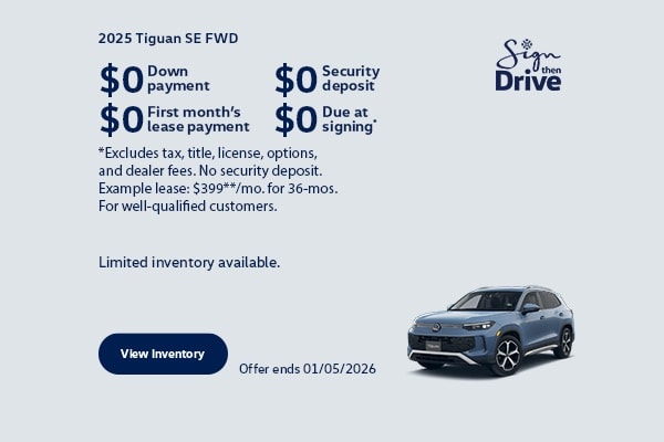 Volkswagen of America, Inc. will apply a $2,000 Conquest Bonus when customers lease or purchase a new, unused 2025 Tiguan, or apply a $750 Conquest Bonus when customers lease or purchase, a new, unused 2025 Taos through participating dealers from October 1, 2025 to January 5, 2026. Must currently own or lease or share a household with individual who owns or leases, an eligible Honda vehicle (proof of ownership, registration, and/or residency may be required). Eligible Honda vehicles include Model Year 2015 Honda models or later. Limit one incentive per eligible Honda VIN. Either one Loyalty Bonus or one Conquest Bonus per customer. No trade-in required. Offers are non-transferable. Bonus applied toward MSRP in a lease or purchase contract and is not redeemable for cash. Bonus cannot be combined on any Loyalty-related, Fleet or Dealership Sales Programs. Corporations, companies, businesses, and dealers, fleet leasing, fleet management or dealer- affiliated fleet companies that own or lease an eligible competitive vehicle are not eligible. See your participating Volkswagen dealer for details or, for general product information, call 1-800-Drive-VW. ©2025 Volkswagen of America, Inc.